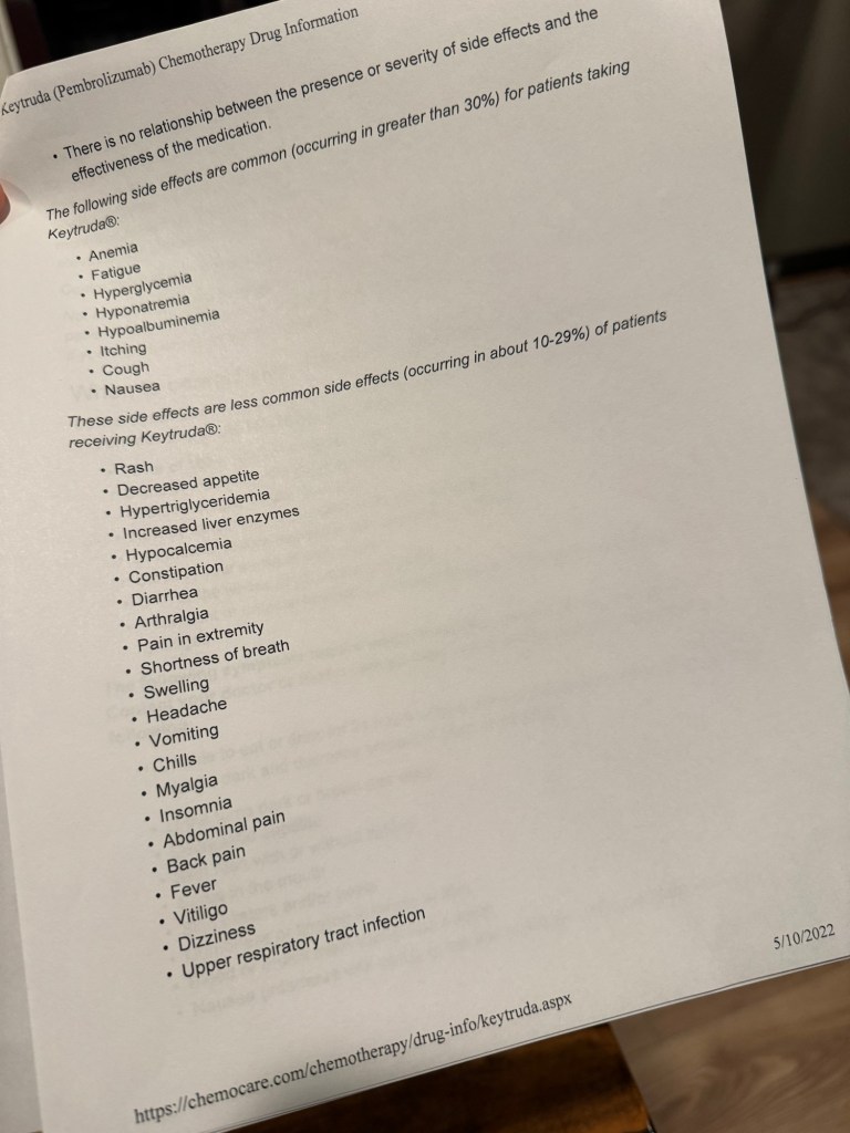 The infusion starts with accessing your port (mine was left accessed due to having it placed the day before). Then you get your pre-meds (Benadryl, anti-nausea and Pepcid) which made me very drowsy and a bit woozy due to fasting and not having anything to eat. Then a 30 minute break before infusing chemo and Keytruda. I probably sat in the chemo chair for a total of 5 or 6 hours the first day.