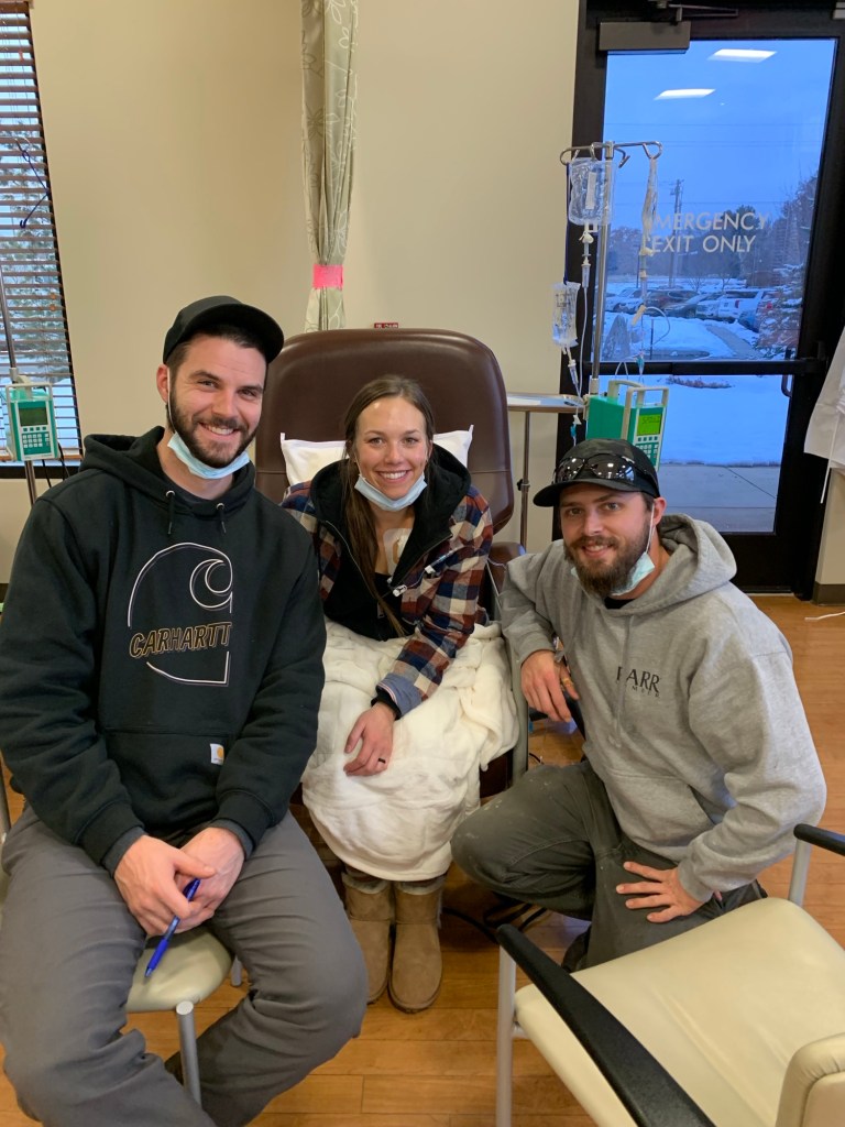 When I say “we” I am referring to my husband and I. He came to every chemotherapy appointment with me, hung out or worked from his computer he brought with him. CCNW allowed 2 visitors during these infusions, so for my first infusion my friend of nearly 15 years joined as well, Brock. The first infusion was longer because they infuse at a slower rate to make sure I am tolerating it and I was also receiving Keytruda, an immunotherapy drug I was going to receive every 3rd treatment. So I found myself a chemo chair (one with a heated seat of course), set up my heated blanket my bosses got me and my new Stanley cup my friend Grace sent me. I got all situated and a couple nurses came up to me with a gift. They introduced themselves and said the gift was from Tracy (the RN that used to work at CCNW that helped me get my appointment with Dr. Moline at the start of all this). The gift consisted of a heat rice pack and a beanie. I remember the note, “A little something to keep you warm”. Which was very helpful, especially when I had to put on my cold mitts during the taxol infusion. The nurses were all very sweet and made me feel comfortable.